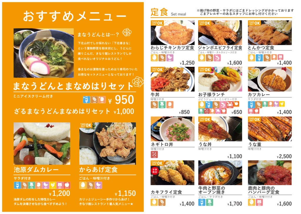 この村でしか育てられない大和野菜「下北春まな」を用いた下北春まなうどんのセット、鹿と豚肉ハンバーグなど各種定食があります。