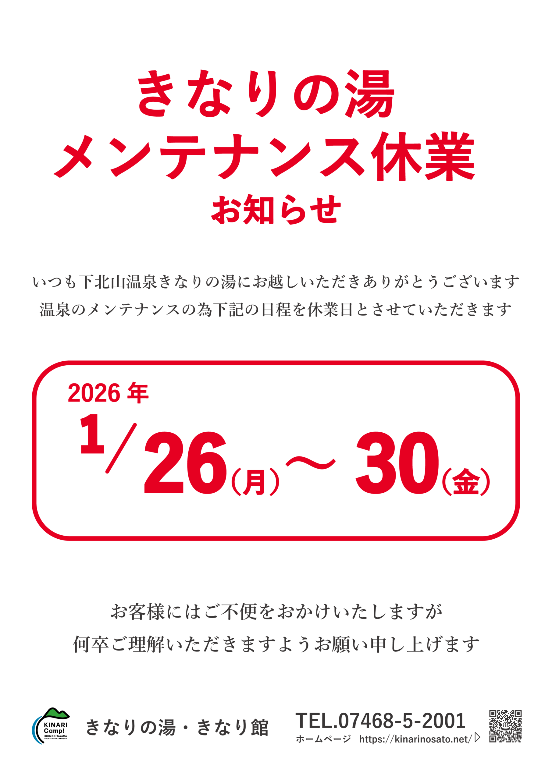期間中はきなり館全館休業となりますので、温泉、売店、レストラン全てお休みとさせていただきます🙇🏻♀️
